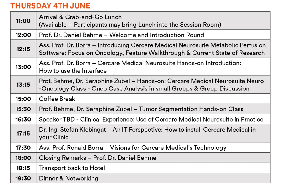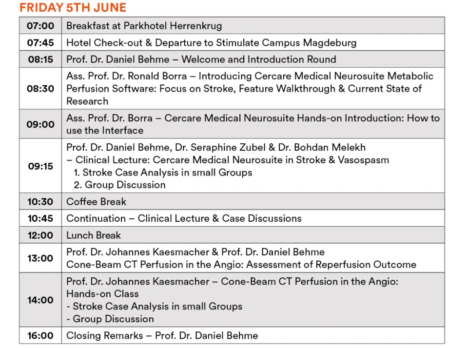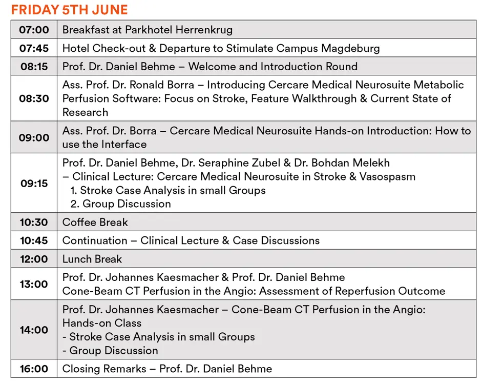 Gain valuable insights from leading experts in the field as you explore how Cercare Medical’s perfusion software is applied in real-world clinical settings. This interactive, hands-on workshop provides a unique opportunity to experience the software in action, as demonstrated by Professor Dr. Daniel Behme and his team at the University Hospital Magdeburg.